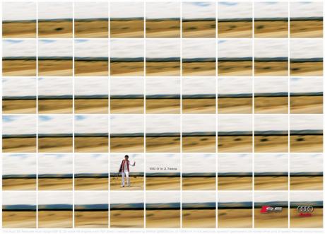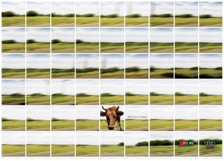 아우디 S5가 달리는 걸 표현하는 것 같은데 과속카메라와 엘비스, 소가 왜 껴있는 건지.
